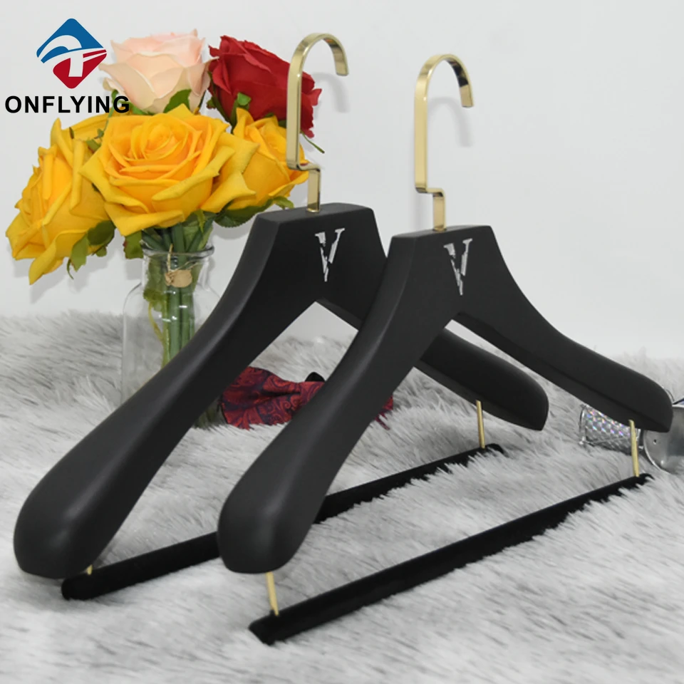 كمية كبيرة من الشماعات الخشبية على وشك الانتهاء. إنه شماعات بدلة خشبية مع مخمل غير على الكتف ، مع شعار مخصص. -