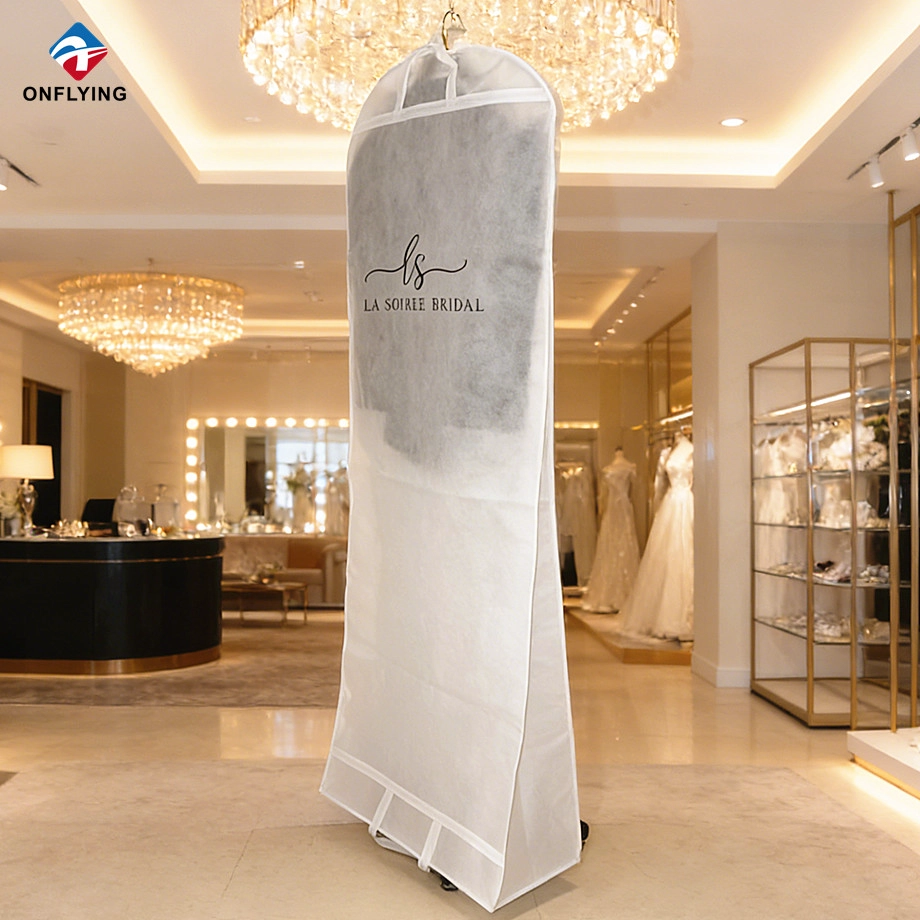 我们昂飞服装辅料实业有限公司是一家 中国服饰旅行包供应商,这款服装婚礼定制徽标盖无纺布袋用于保护。