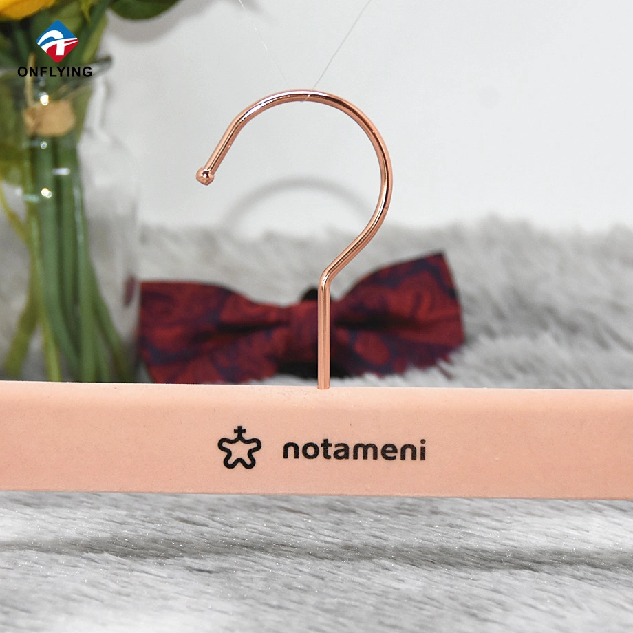 我们昂飞服装辅料实业有限公司是一家 中国天鹅绒裤架供应商,这款天鹅绒衣架定制徽标用于悬挂衣服。