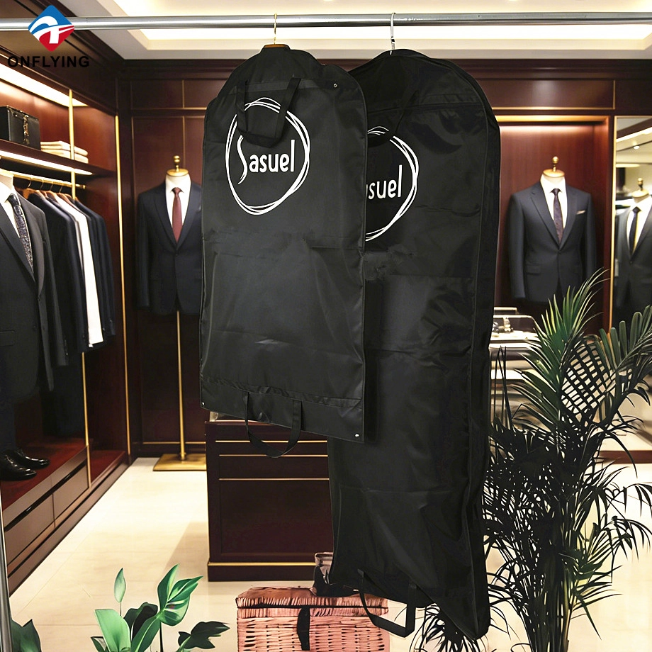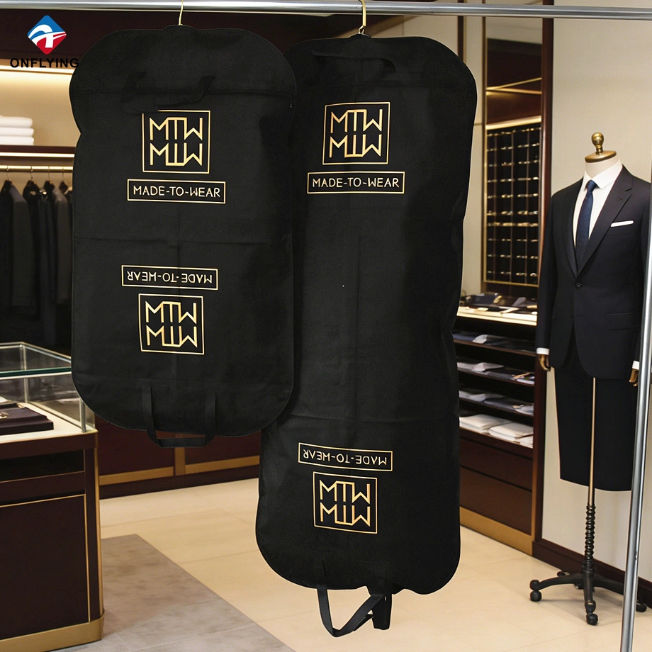 我们昂飞服装辅料实业有限公司是一家 中国无纺布袋套装供应商,这款服装袋定制徽标套用于保护衣服。