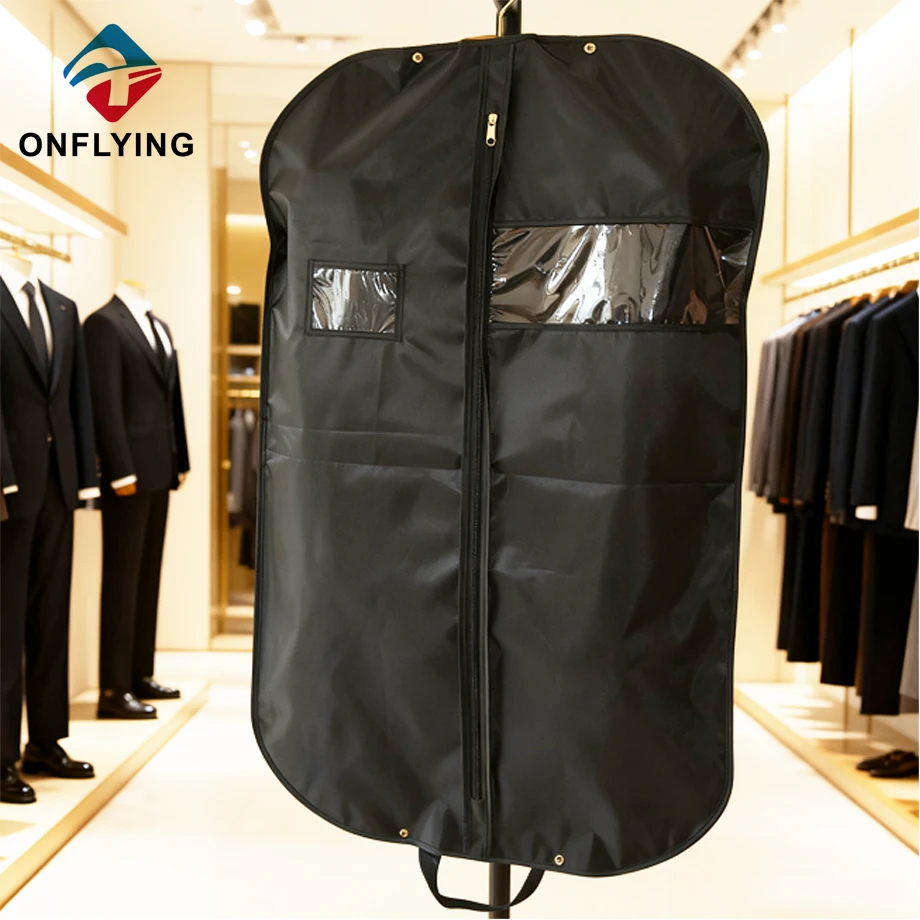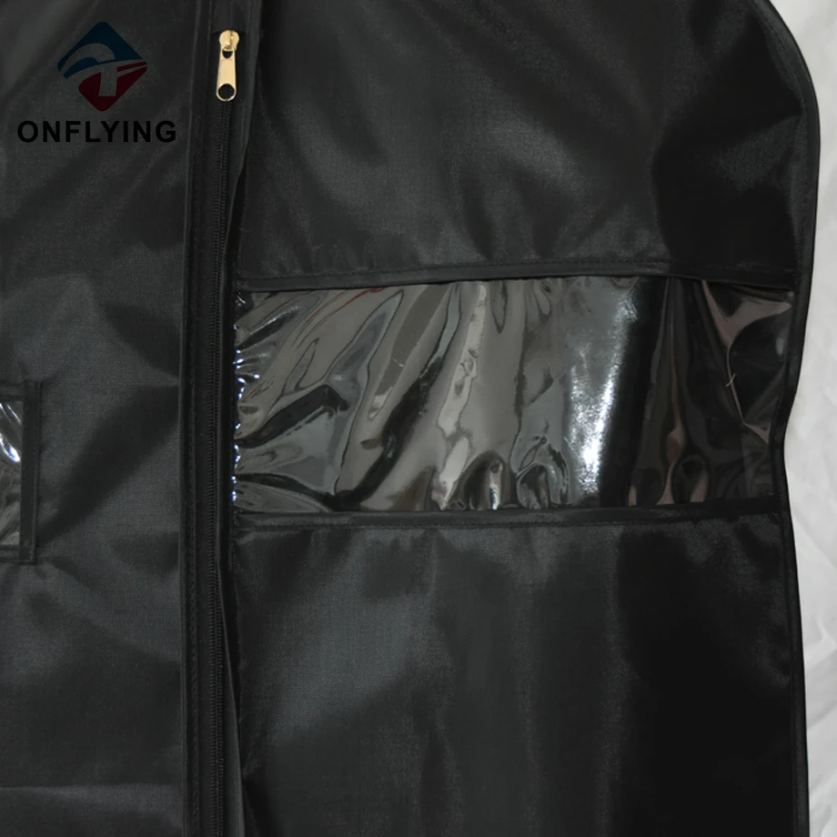 Nous, accessoires de vêtement Onflying Industiral Limited, sommes professionnels Usine de housses de costume en polyester en Chine. Cette housse de costume en polyester noir légère sur mesure avec fenêtre en PVC est destinée au stockage et à la protection des combinaisons.