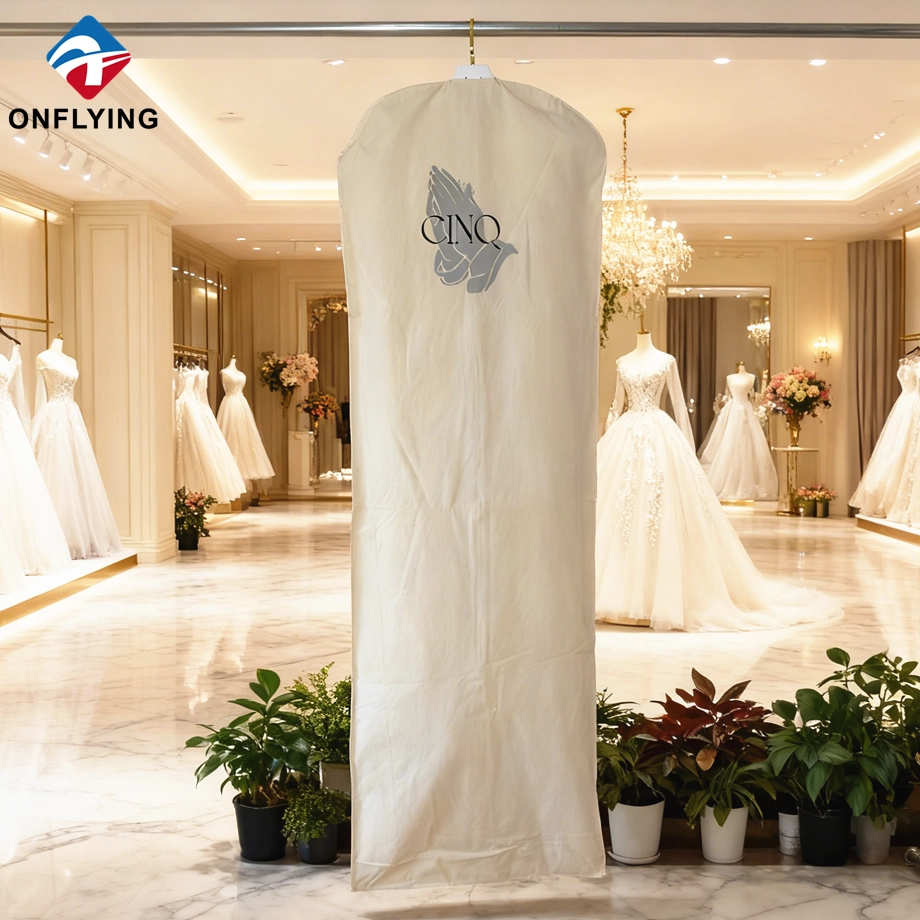 Nous, accessoires de vêtement Onflying Industiral Limited, sommes professionnels Chine Sacs habillés Fabricant personnalisé. Ces sacs de robe de mariée en coton pour vêtements de boutique sont destinés au stockage et à la protection des vêtements.
