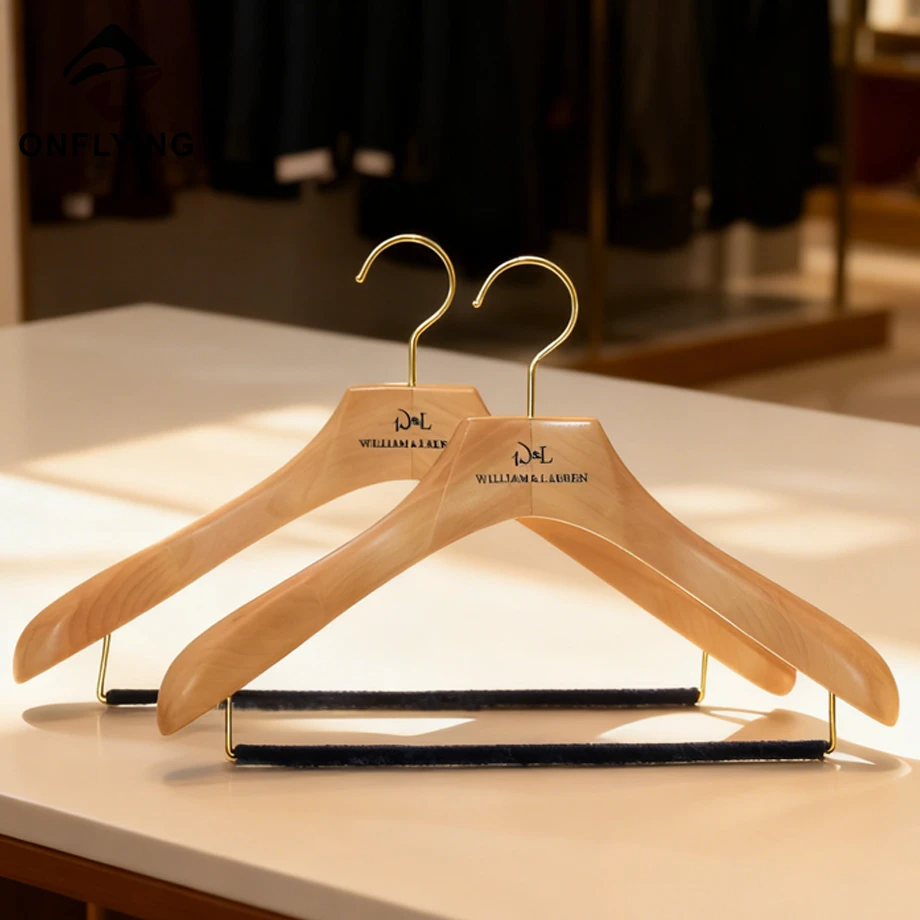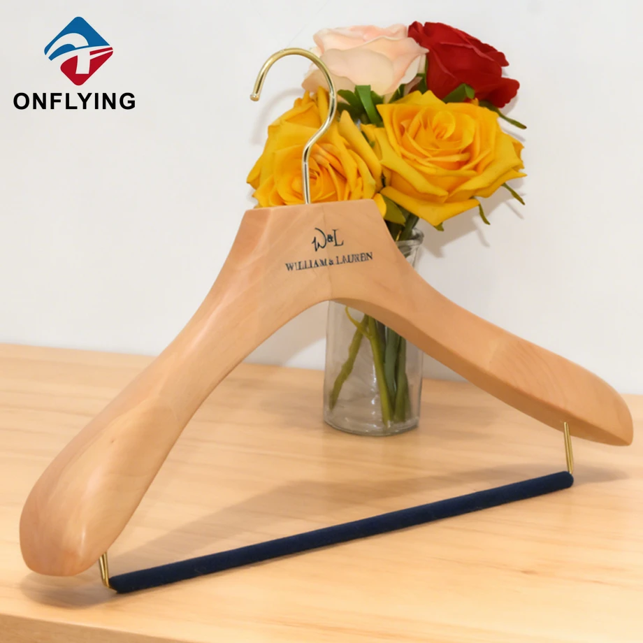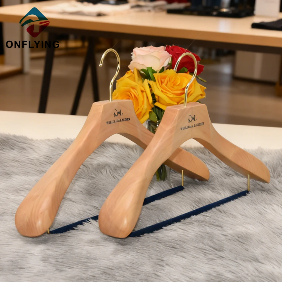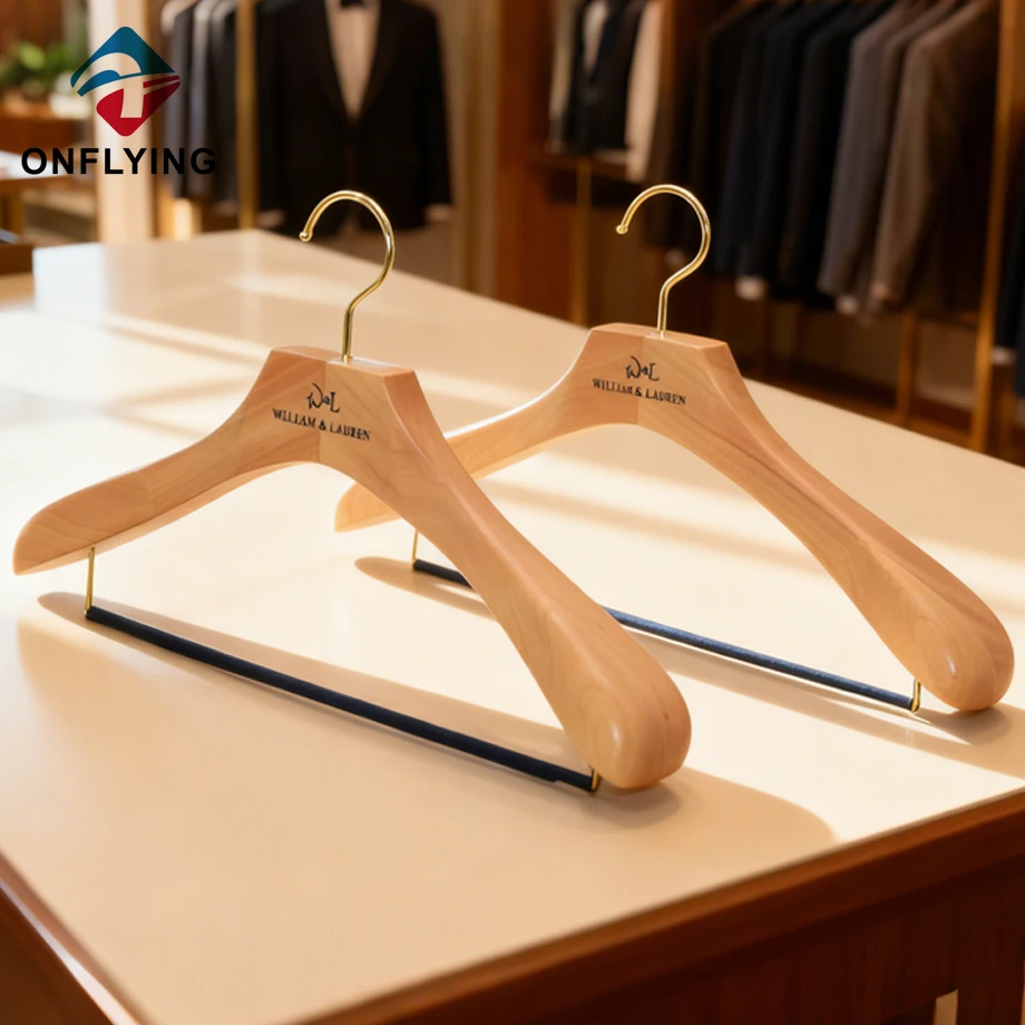 Nous, accessoires de vêtement Onflying Industiral Limited, sommes professionnels Ce cintre en bois avec logo personnalisé pour costume à épaule large et solide de luxe est destiné au stockage et à l'affichage des vêtements de manteau de costume.