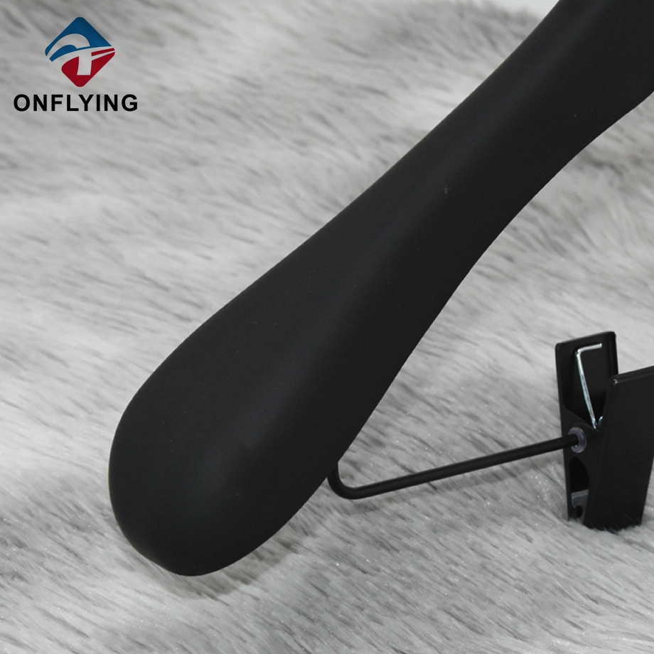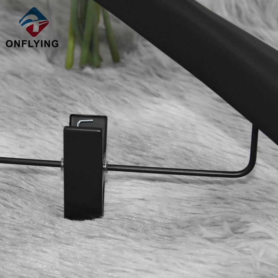 Nous, accessoires de vêtement Onflying Industiral Limited, sommes professionnels Ce cintre en bois noir robuste avec des clips solides pour dames est destiné au stockage et à l'affichage des vêtements de jupe, de blazer et de manteau.