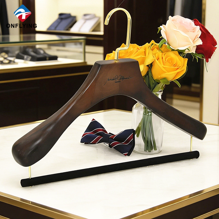 Nous Onflying Garment Accessories Industiral Limited est un Chine Cintre en bois fournisseur, Ce cintre en bois avec logo personnalisé est destiné à suspendre des vêtements.