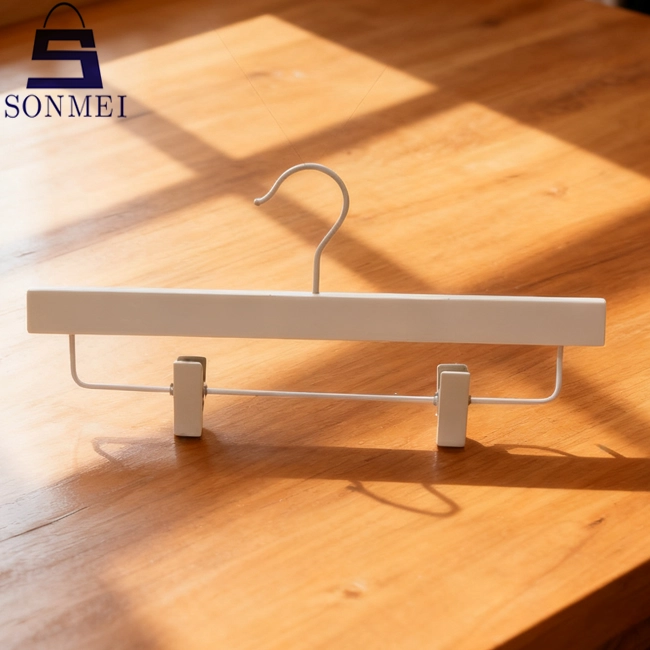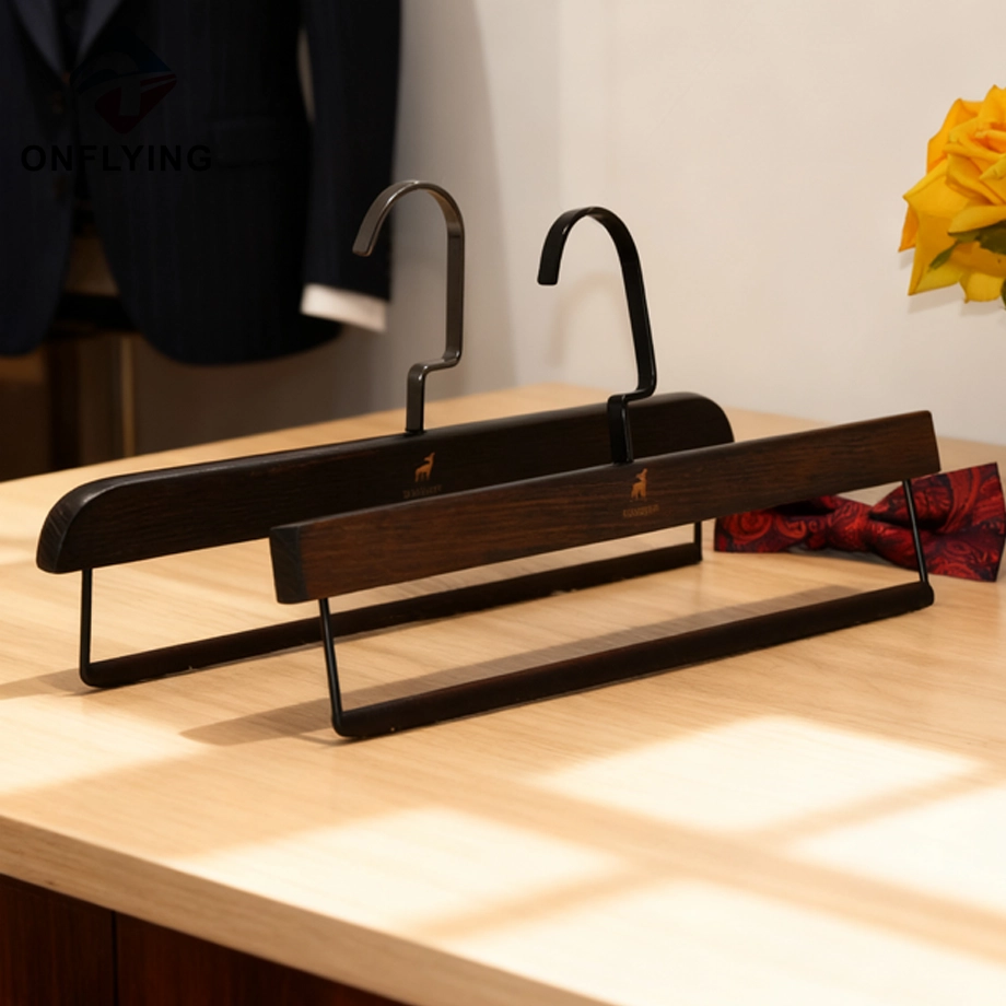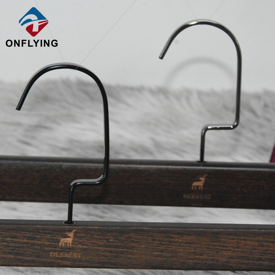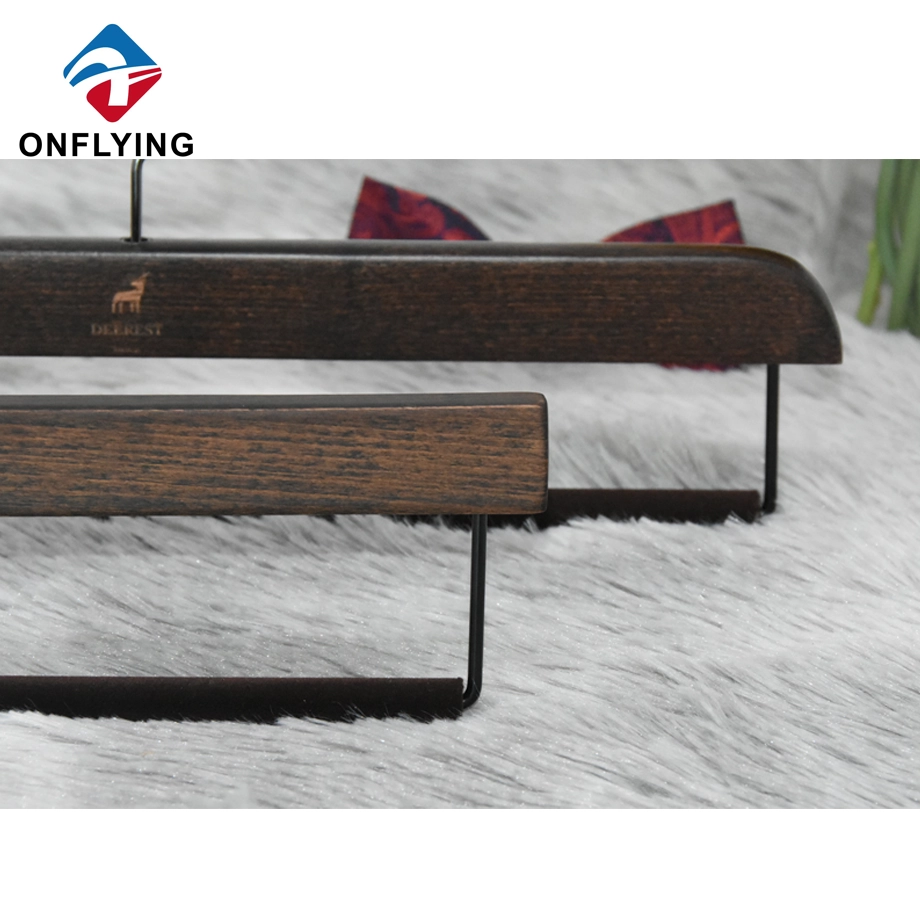 Nous, accessoires de vêtement Onflying Industiral Limited, sommes professionnels .Ces cintres pour pantalons en bois de hêtre avec logo gravé en velours marron massif sont destinés au rangement et à l'affichage des pantalons et des vêtements.