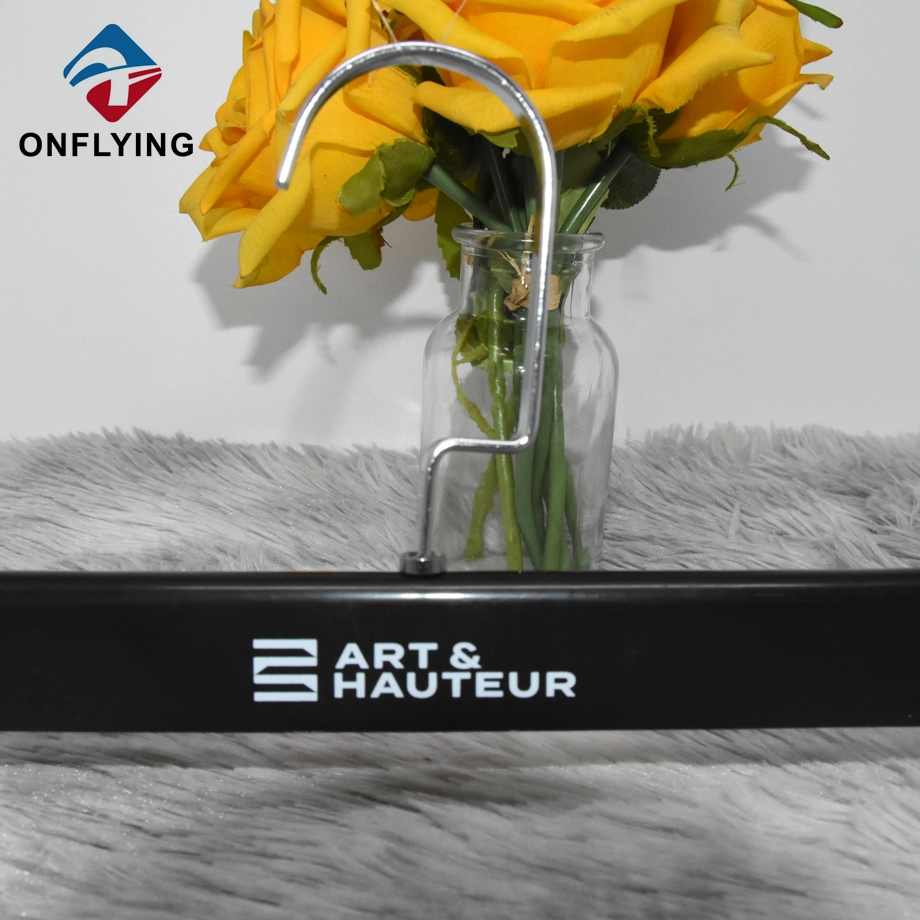 Nous, accessoires de vêtement Onflying Industiral Limited, sommes professionnels .Ce cintre de pantalon en plastique personnalisé noir élégant avec des clips solides est destiné au stockage et à l'affichage de vêtements de jupe, de pantalon et de pantalon.