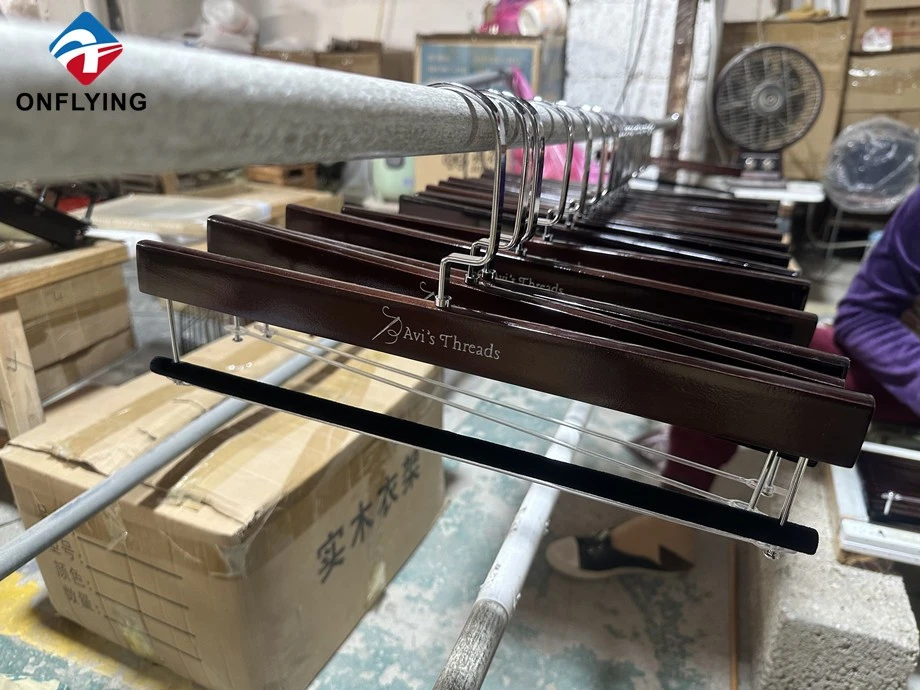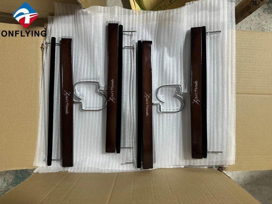 省スペース設計を特徴とするこれらの高級ハンガーには、滑りを防止し、パンツをきちんと整理できる植毛クロスバーが付いています。サイズ、色、ロゴ、金具のカスタマイズが完全に可能なため、高級小売店やブランドに最適です。すべての製品は厳格な品質検査に合格し、現在倉庫に保管されており、出荷の準備が整っています。オンフライング ガーメント アクセサリー インダストリアル リミテッドは、 中国の木製パンツ ハンガー サプライヤー、ブランドやブティックに高級品を提供できます。