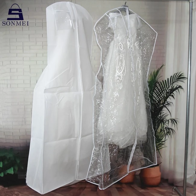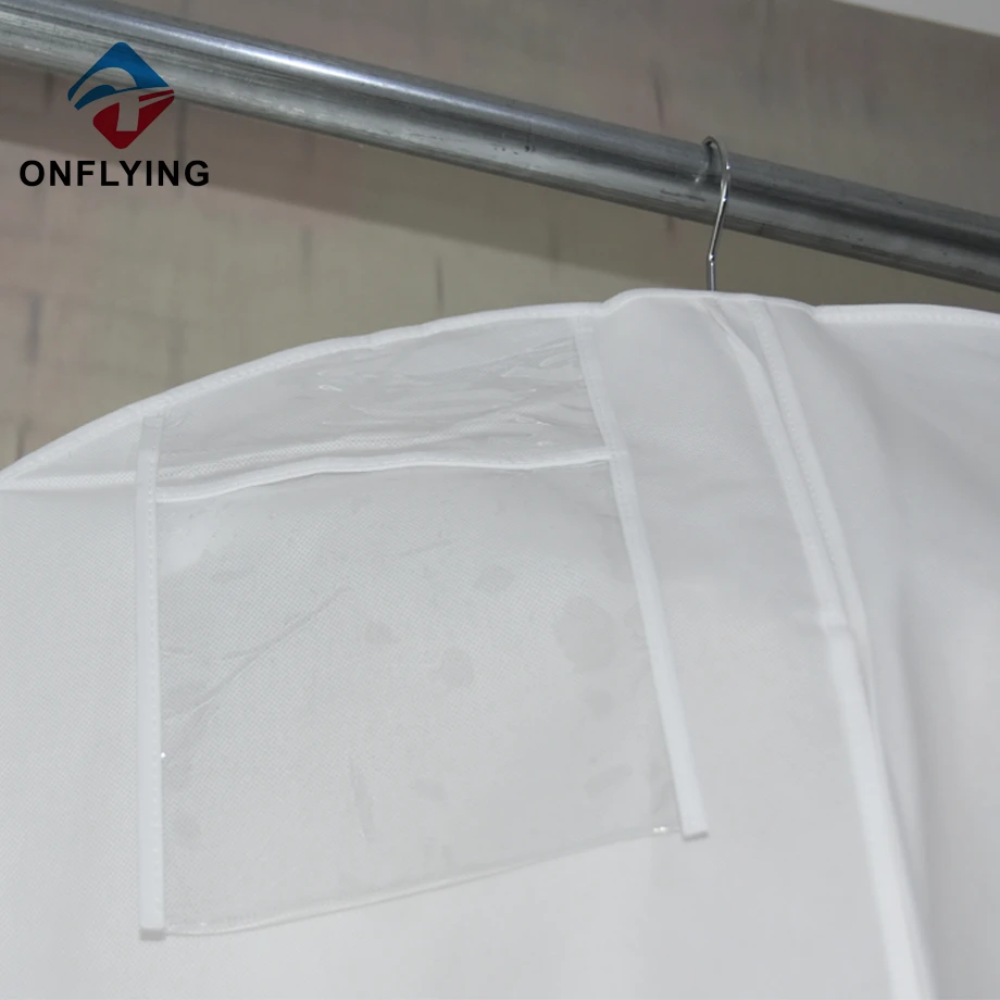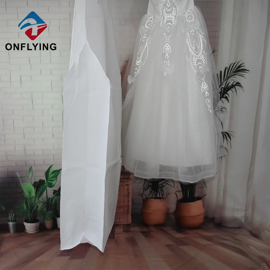 衣服アクセサリーインドゥスティラルリミテッドはプロフェッショナルです 中国のダストバッグ工場。このカスタムの特別な白い織られていないブライダルウェディングドレスダストバッグは、ウェディングドレスの保管と保護用です。