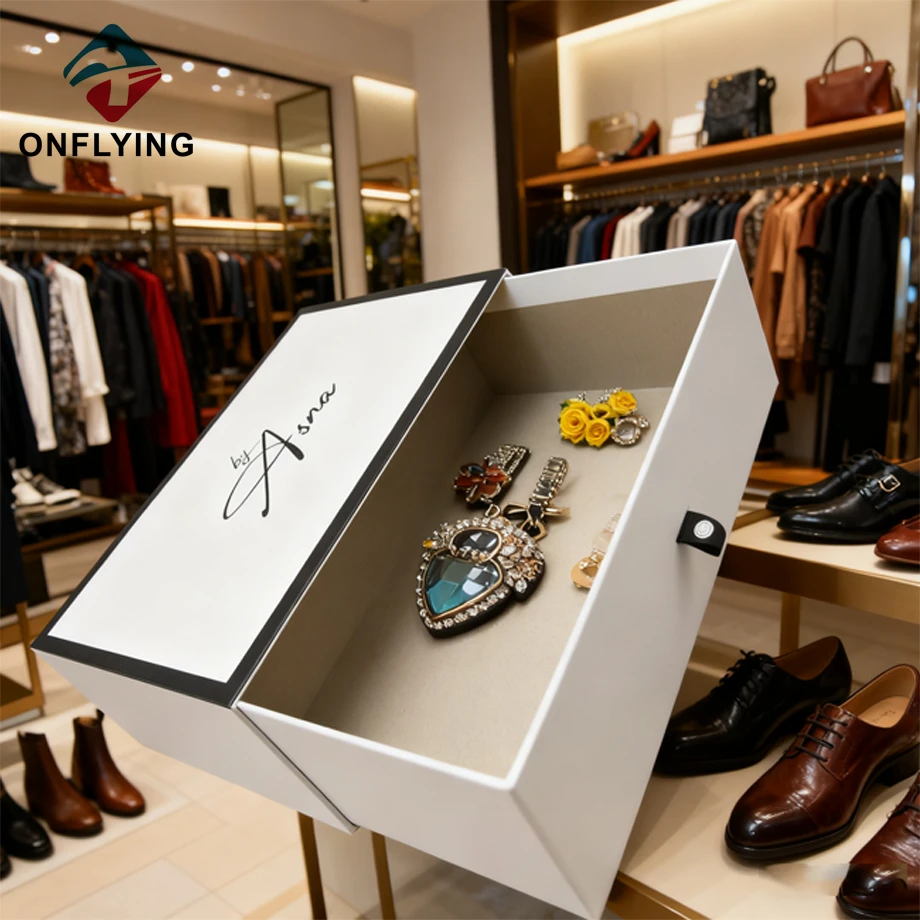 私たちオンフライング ガーメント アクセサリー インダストリアル リミテッドはプロフェッショナルです 中国ギフト紙箱工場。この耐久性のあるカスタム折りたたみ可能な硬質板紙ギフト紙箱は、ブティックショップ、保管場所などに最適です。
