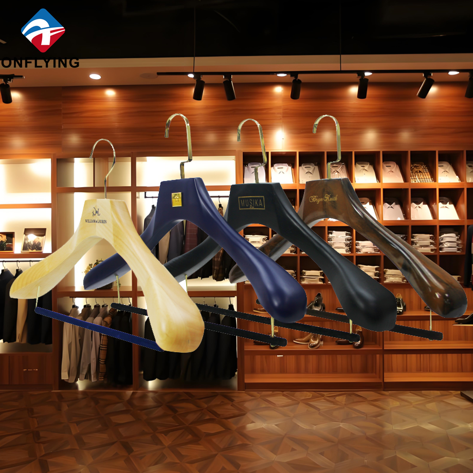 衣服アクセサリーインドゥスティラルリミテッドはプロフェッショナルです 中国の木製ハンガーサプライヤー。この光沢のある茶色のカスタム服の豪華な男性は、大きな木製のハンガーにスーツを着て、衣服の保管と展示用です。