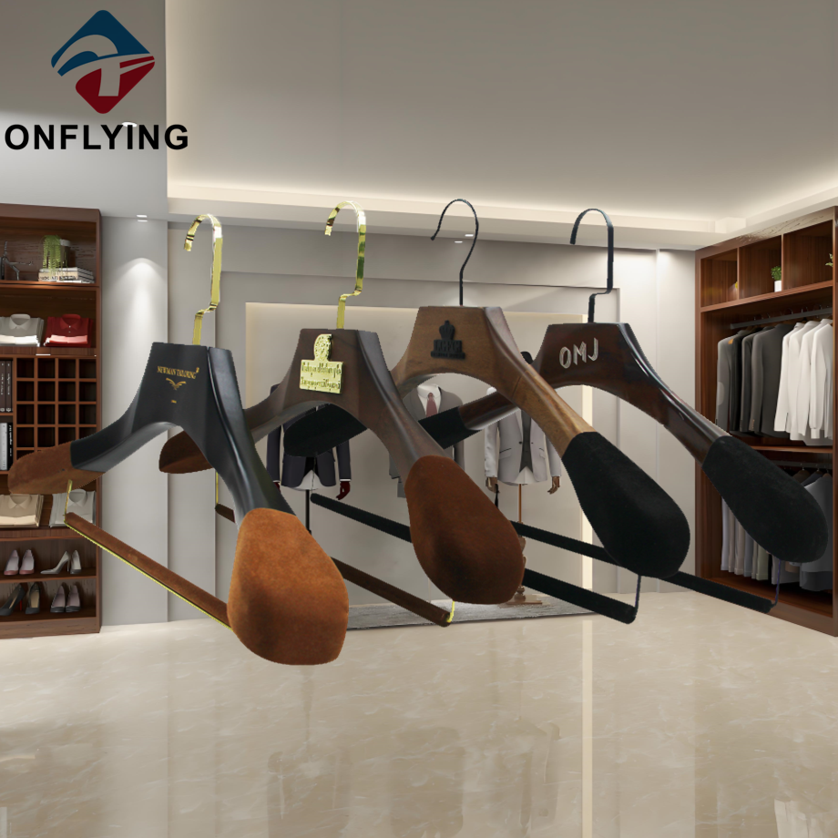 大量のウッドハンガーが終了しようとしています。それは、カスタムロゴを備えた肩にnonslipベルベットを備えた木製のスーツハンガーです。 -