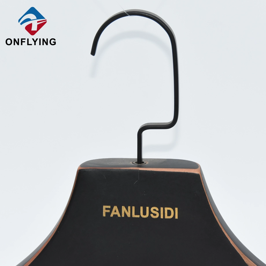 私たちオンフライング ガーメント アクセサリー インダストリアル リミテッドはプロフェッショナルです この高耐久ブラックスクエアフック木製高級洋服ハンガーは、コートの衣類の保管と展示に最適です。