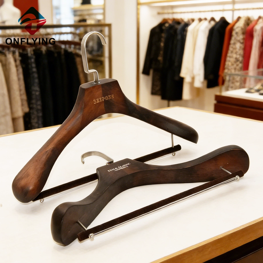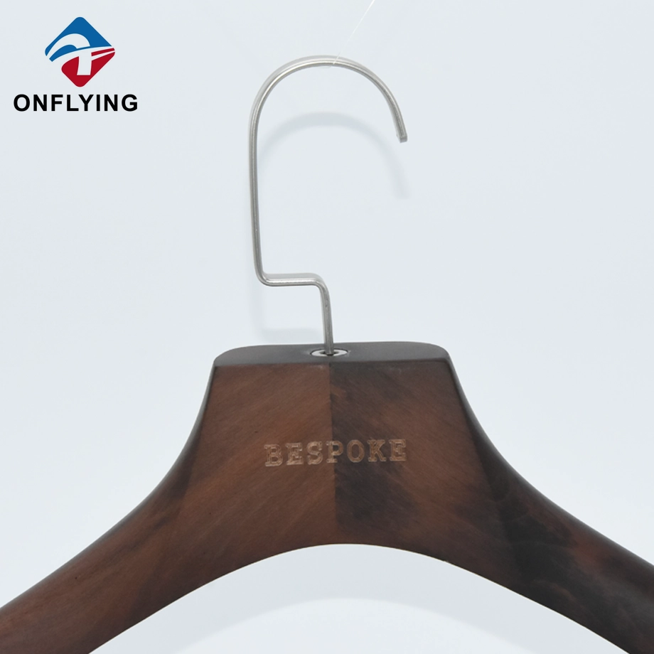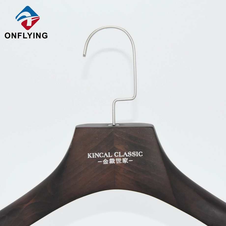 私たちオンフライング ガーメント アクセサリー インダストリアル リミテッドはプロフェッショナルです 高級木製ハンガー中国サプライヤーこの高耐久ブラウンカスタムロゴワイドショルダーメンズスーツ服高級木製ハンガー スーツ、コート、ブレザー、ジャケットなどの衣類の保管と展示に最適です。