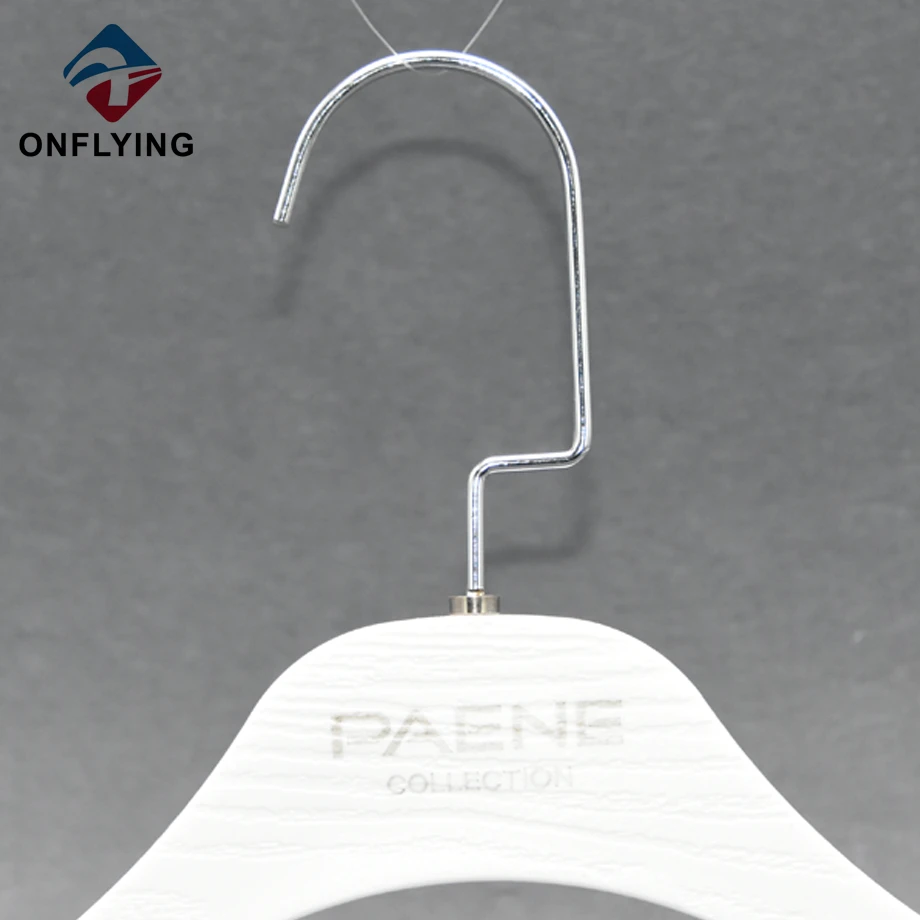 私たちオンフライング ガーメント アクセサリー インダストリアル リミテッドはプロフェッショナルです ドレスプラスチックハンガー中国サプライヤーこの高耐久カスタムロゴ滑り止めショルダーホワイトドレスプラスチックハンガーは、ドレスシャツ、ブレザー、ジャケットの衣類の保管と展示に最適です。