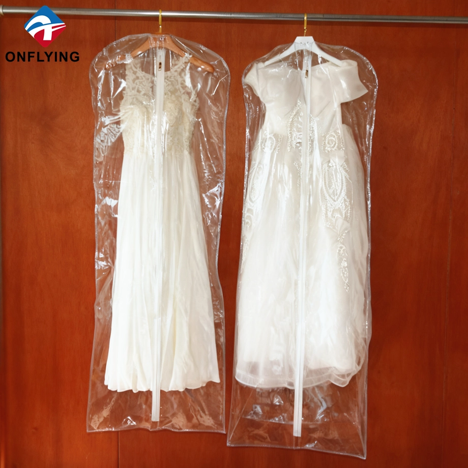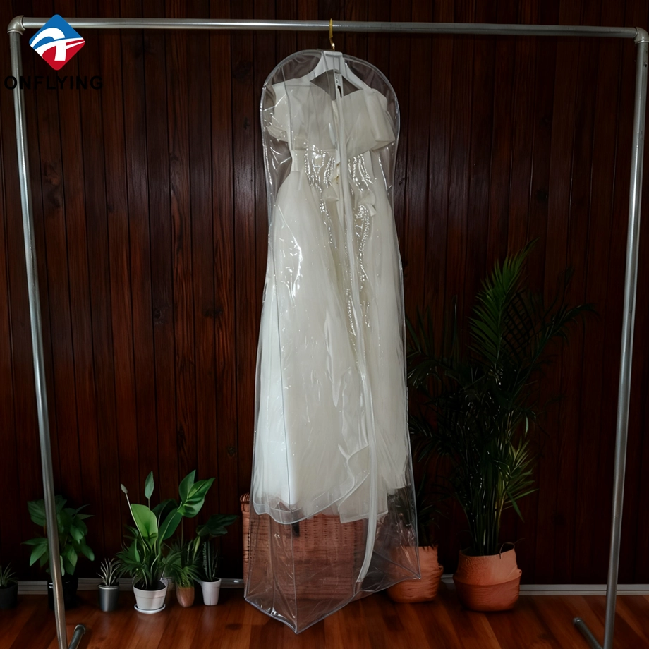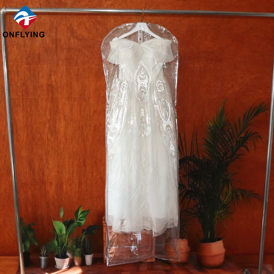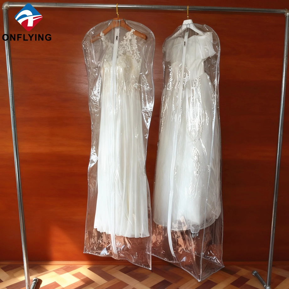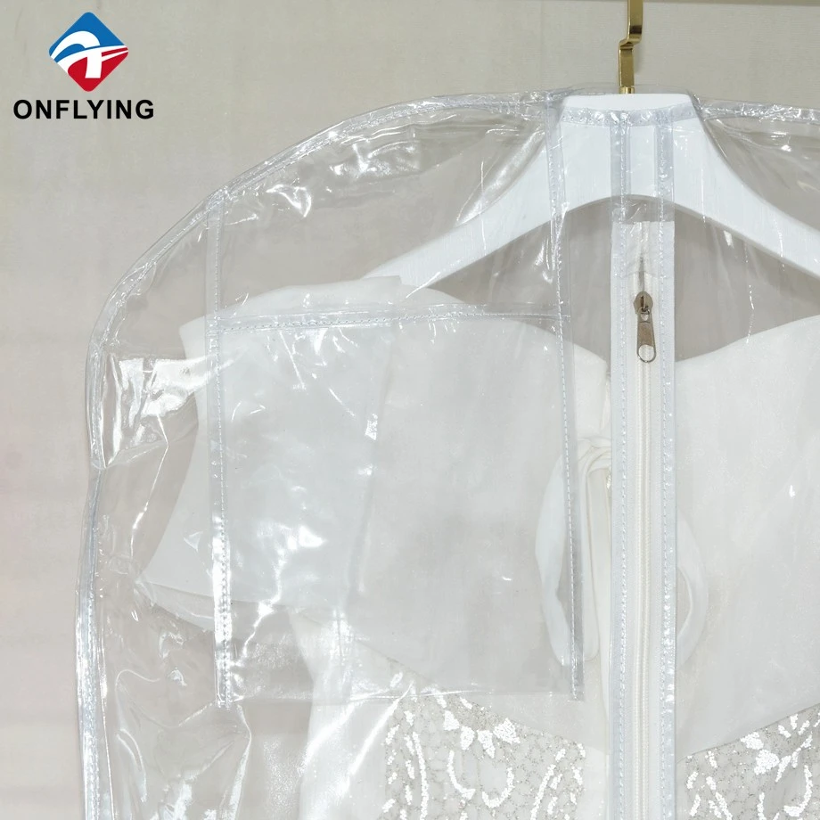 私たちオンフライング ガーメント アクセサリー インダストリアル リミテッドはプロフェッショナルです 中国PVCガーメントバッグメーカー。この高品質の折りたたみ式ウェディング ドレス ガーメント バッグ ジッパー付き透明な透明 PVC ガーメント バッグは、ガーメント ドレスの保管と保護用です。