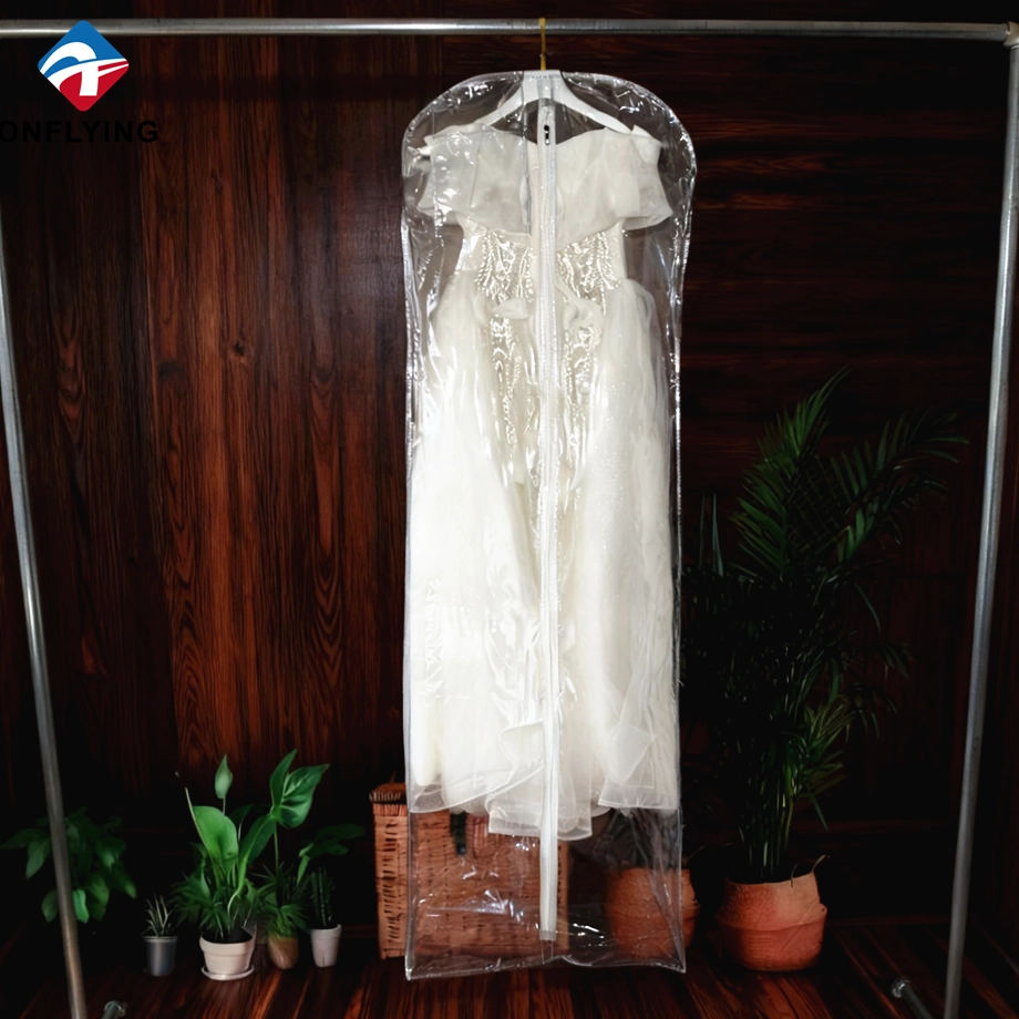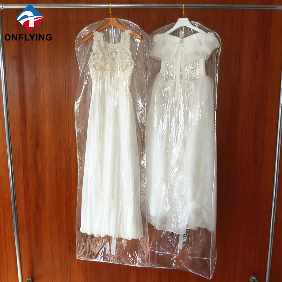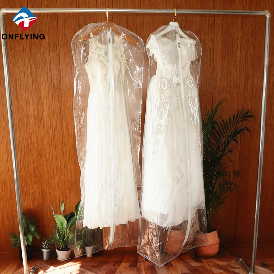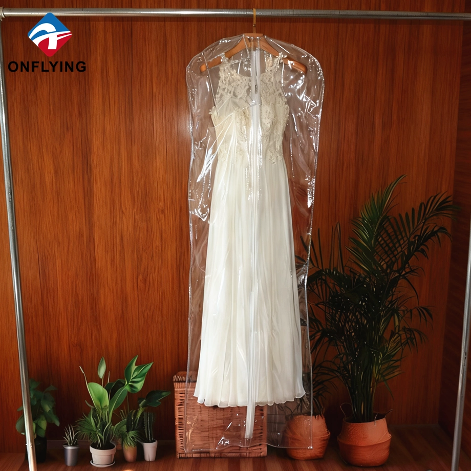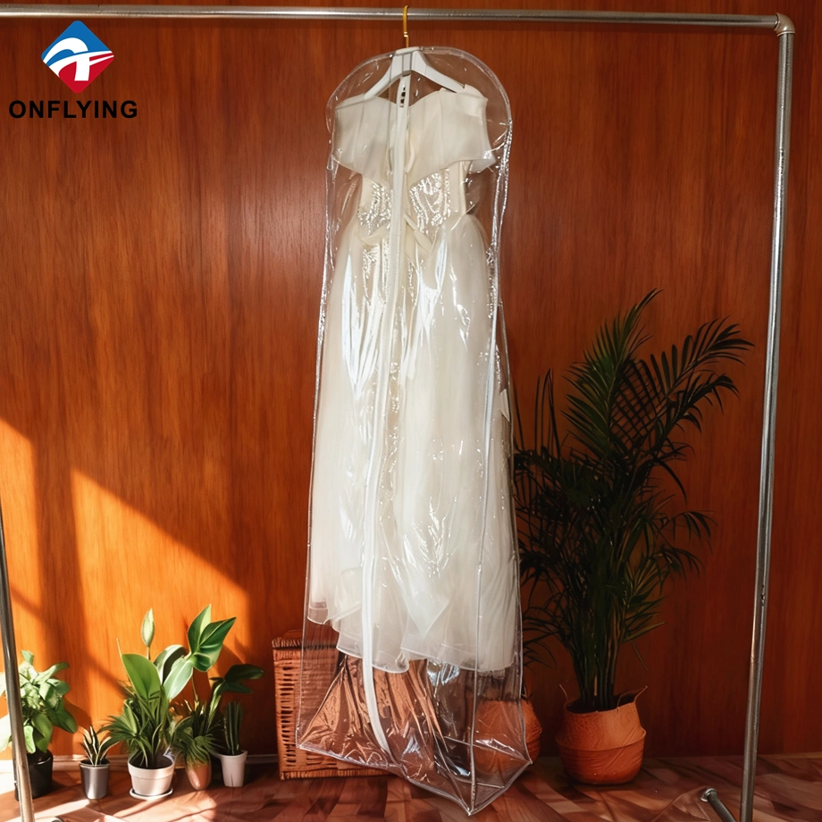私たちオンフライング ガーメント アクセサリー インダストリアル リミテッドはプロフェッショナルです 中国PVCガーメントバッグメーカー。この高品質の折りたたみ式ウェディング ドレス ガーメント バッグ ジッパー付き透明な透明 PVC ガーメント バッグは、ガーメント ドレスの保管と保護用です。