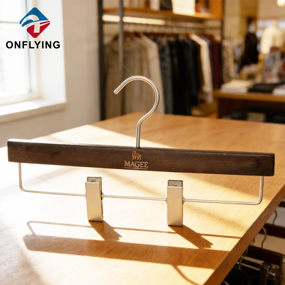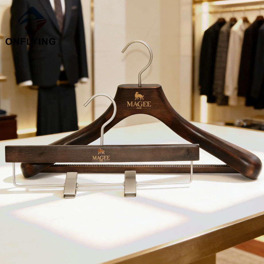 私たちオンフライング ガーメント アクセサリー インダストリアル リミテッドはプロフェッショナルです この高級滑り止めバーメンズスーツパンツ木製高級ハンガーセットは、スーツコート衣類の保管と展示に最適です。