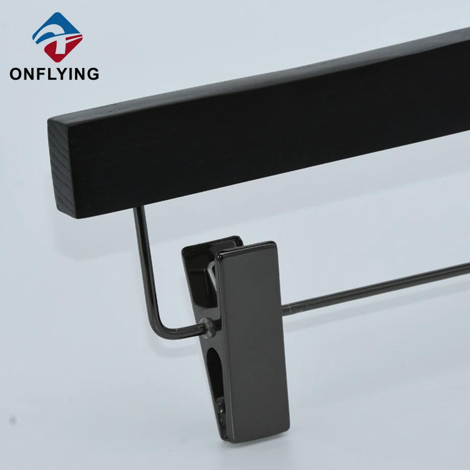 私たちオンフライング ガーメント アクセサリー インダストリアル リミテッドはプロフェッショナルです カスタマイズされたロゴ付きのこの高級ブラックアッシュツリー木製コートハンガーセットは、コート衣類の保管と展示に最適です。