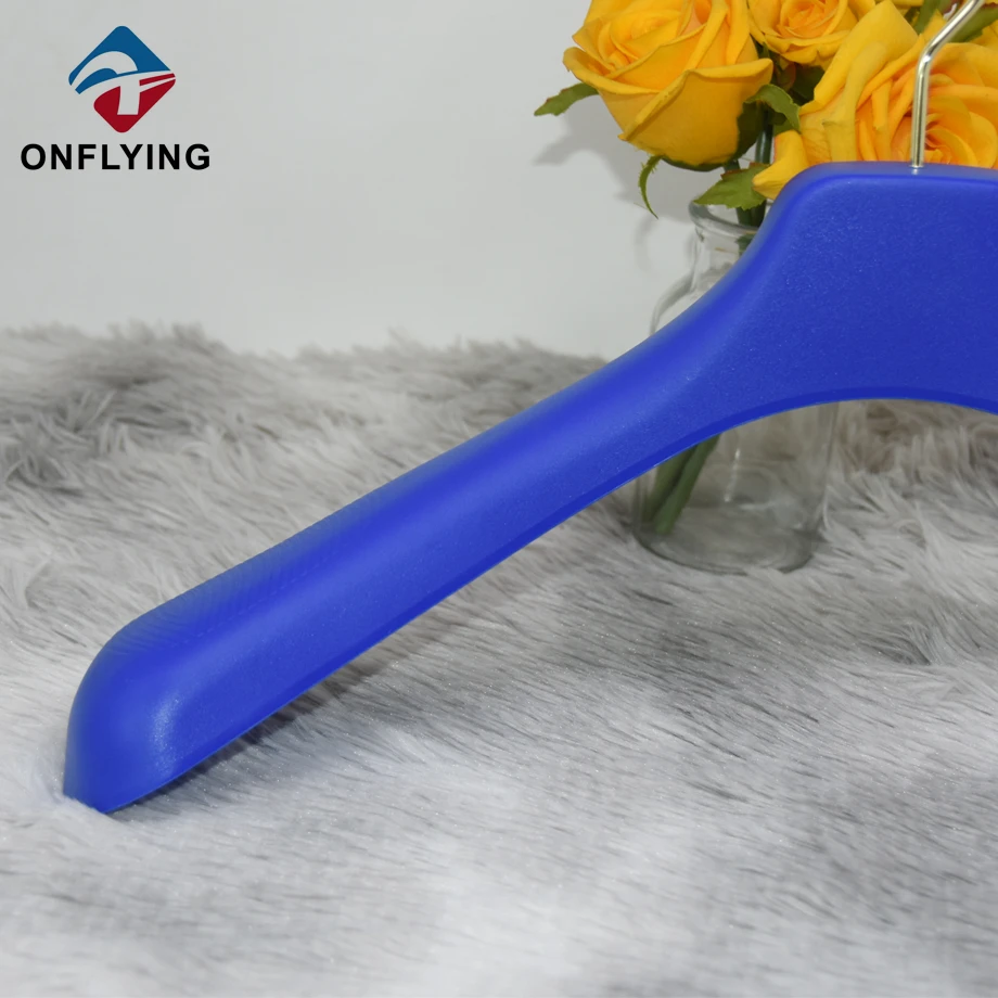 衣服アクセサリーインドゥスティラルリミテッドはプロフェッショナルです 服のハンガーカスタムロゴ中国のサプライヤー衣服用のこの豪華なカスタム耐久性のあるブルーハンガーカスタムロゴは、コートの服の保管と展示用です。