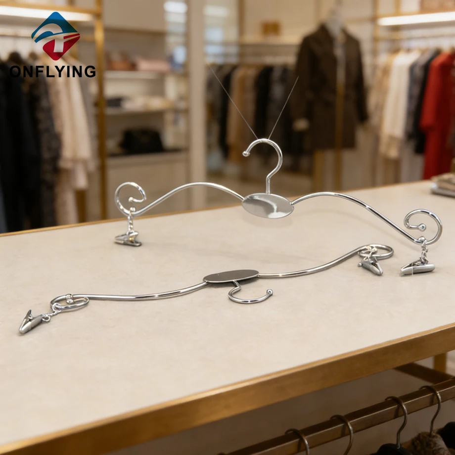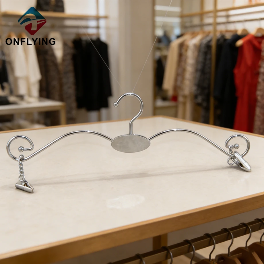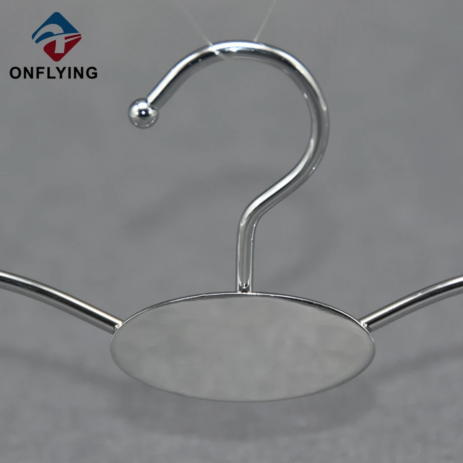 私たちオンフライング ガーメント アクセサリー インダストリアル リミテッドはプロフェッショナルです 銀色の金属ハンガー中国サプライヤーこのプレミアム光沢のあるステンレス鋼とクリップの銀色の金属ハンガーは、ボトム下着の衣類の保管と展示に使用されます。