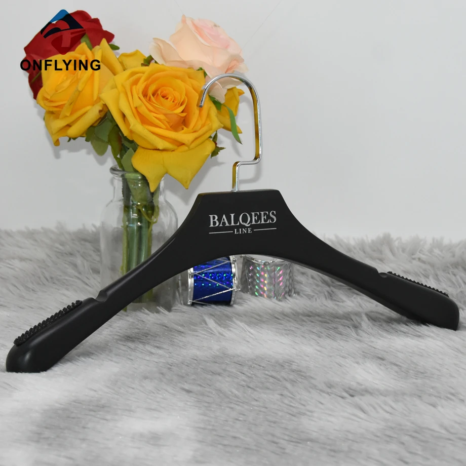 衣服アクセサリーインドゥスティラルリミテッドはプロフェッショナルです カスタマイズされたハンガー中国のサプライヤー これ スタイリッシュな高品質の黒いドレス木製カスタマイズされたハンガーは、コートブレザージャケットの服の保管と展示用です。