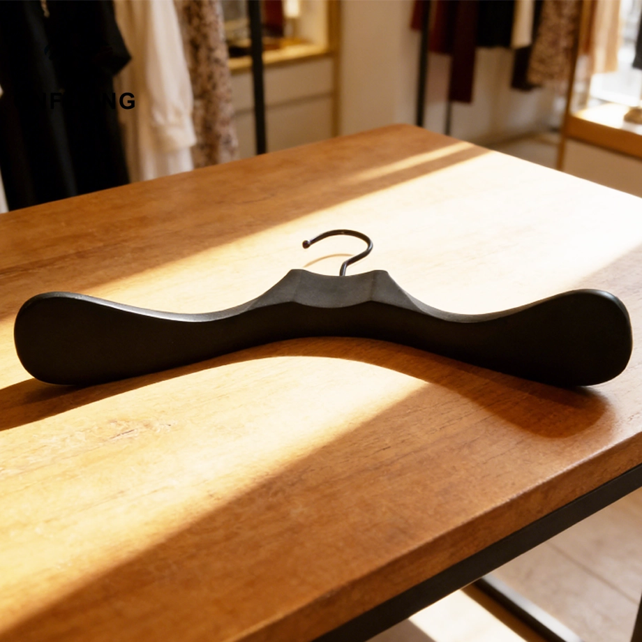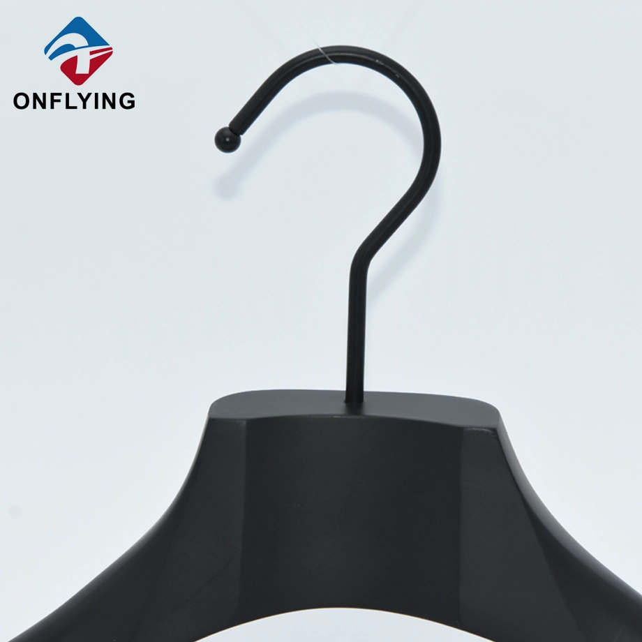 私たちオンフライング ガーメント アクセサリー インダストリアル リミテッドはプロフェッショナルです このトップエンドラウンドフック衣類コートブラック木製ハンガーは、コートブレザー衣類の保管と展示に使用されます。