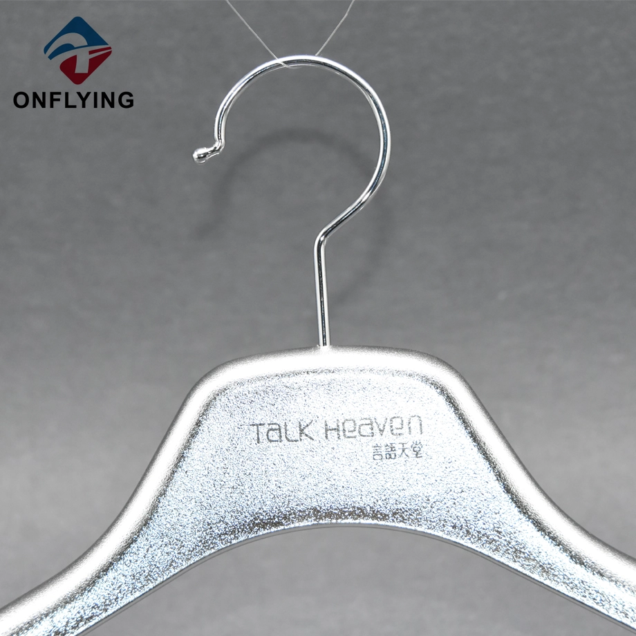 私たちオンフライング ガーメント アクセサリー インダストリアル リミテッドはプロフェッショナルです ドレスハンガー中国サプライヤーこの光沢のあるカスタム銀色電気めっきプラスチックブライダルドレスハンガーは、ドレスブレザーコートジャケット衣類の保管と展示用です。