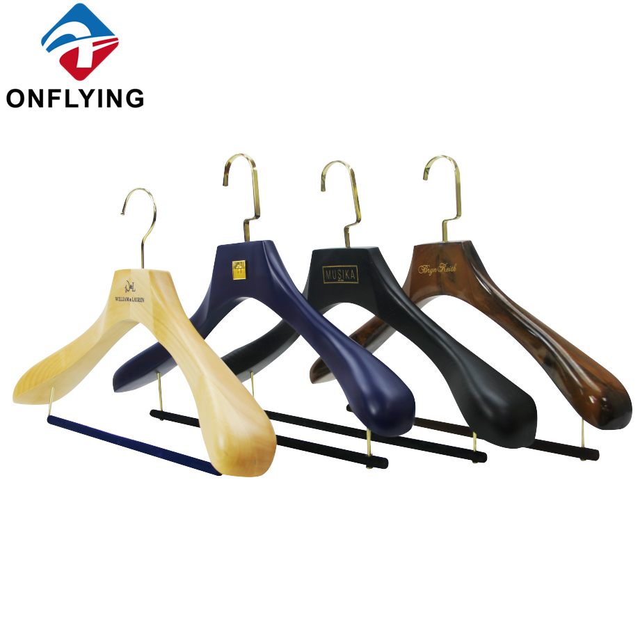 A large quantity of wood hangers are about to be finished. It is wooden suit hanger with nonslip velvet on shoulder, with custom logo. -