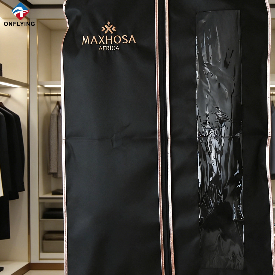 We Onflying Garment Accessory Industiral Limited is a China Suit Garment Cover supplier, This black Garment Bag Custom Logo Covers is for clothes protection.