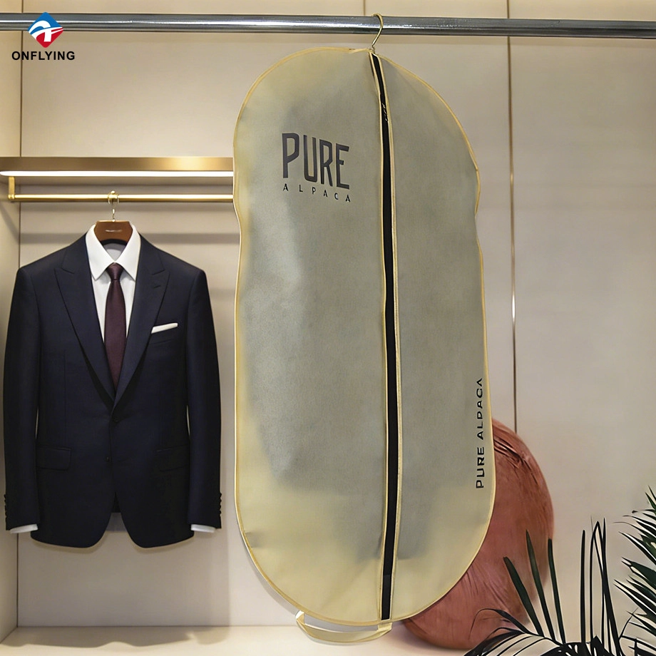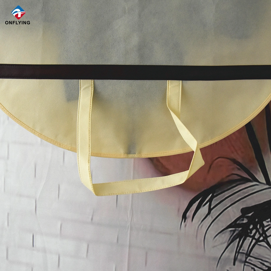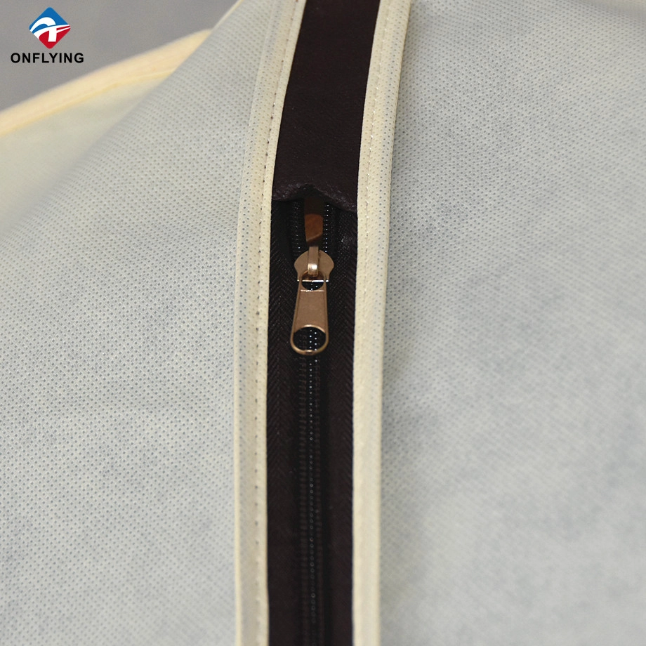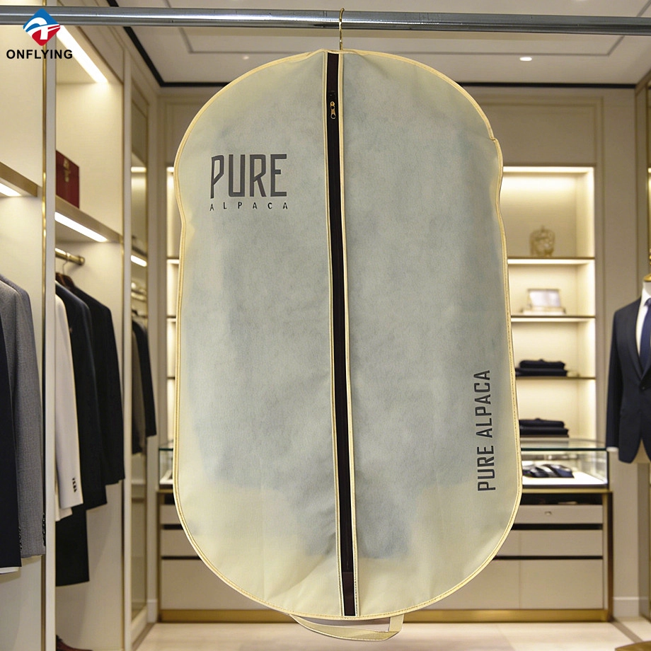 We Onflying Garment Accessory Industiral Limited is a China Suit Bag manufacturer, This creamy Garment Bag Custom Logo Covers is for clothes protection.