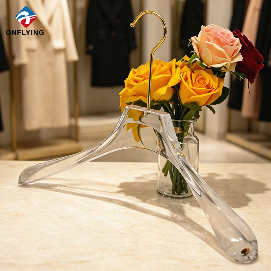 Nós Onflying Garment Accessories Industiral Limited é uma Fornecedor de cabide de acrílico na China, Este cabide de acrílico com logotipo personalizado é para pendurar roupas.